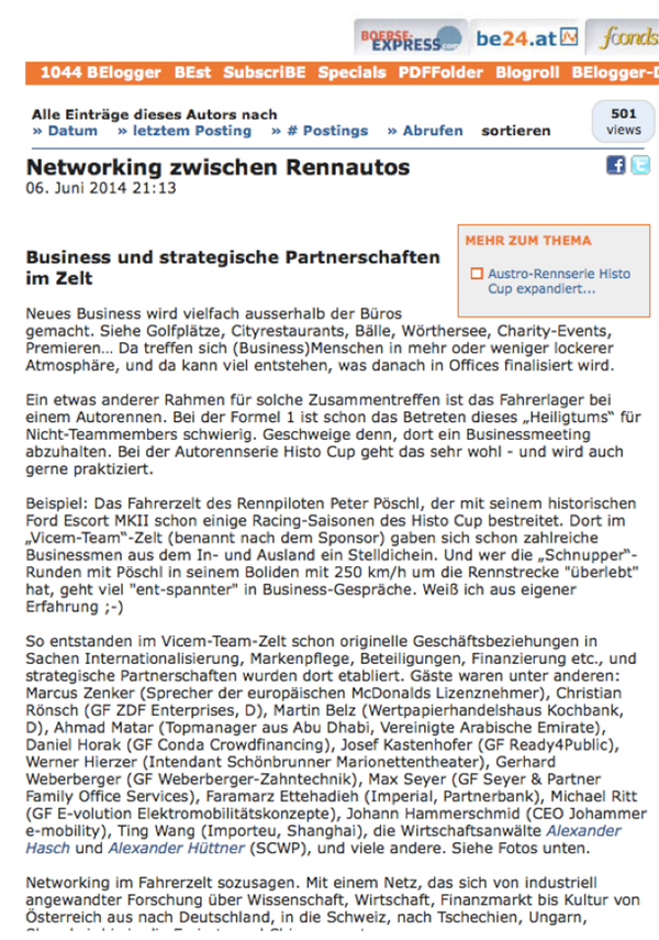 So entstanden im Vicem-Team-Zelt schon originelle Geschäftsbeziehungen in Sachen Internationalisierung, Markenpflege, Beteiligungen, Finanzierung etc., und strategische Partnerschaften wurden dort etabliert. Gäste waren unter anderen: Marcus Zenker (Sprecher der europäischen McDonalds Lizenznehmer), Christian Rönsch (GF ZDF Enterprises, D), Martin Belz (Wertpapierhandelshaus Kochbank, D), Ahmad Matar (Topmanager aus Abu Dhabi, Vereinigte Arabische Emirate), Daniel Horak (GF Conda Crowdfinancing), Josef Kastenhofer (GF Ready4Public), Werner Hierzer (Intendant Schönbrunner Marionettentheater), Gerhard Weberberger (GF Weberberger-Zahntechnik), Max Seyer (GF Seyer & Partner Family Office Services), Faramarz Ettehadieh (Imperial, Partnerbank), Michael Ritt (GF E-volution Elektromobilitätskonzepte), Johann Hammerschmid (CEO Johammer e-mobility), Ting Wang (Importeu, Shanghai), die Wirtschaftsanwälte Alexander Hasch und Alexander Hüttner (SCWP), und viele andere. […]